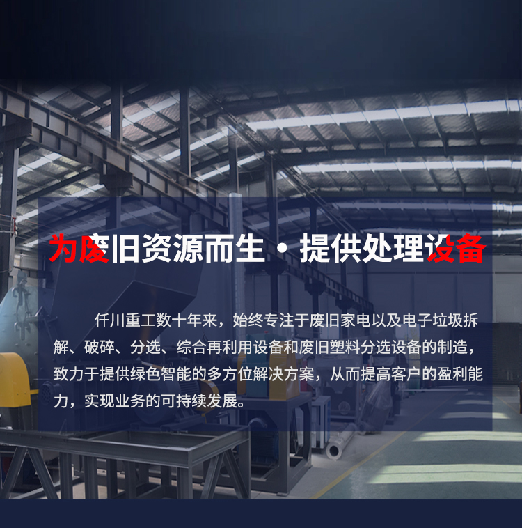 仟川重工數十年來,始終專注于廢舊家電以及電子垃圾拆解、破碎、分選、綜合再利用設備和廢舊塑料分選設備的制造,致力于提供綠色智能的多方位解決方案,從而提高客戶的盈利能力,實現業務的可持續發展。